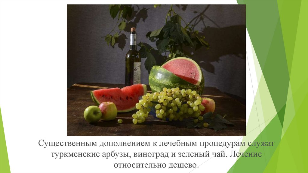 Существенным дополнением к лечебным процедурам служаттуркменские арбузы, виноград и зеленый чай. Лечение