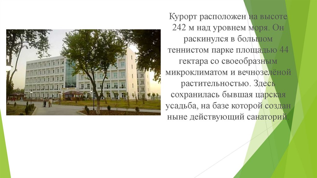 Курорт расположен на высоте242 м над уровнем моря. Он
