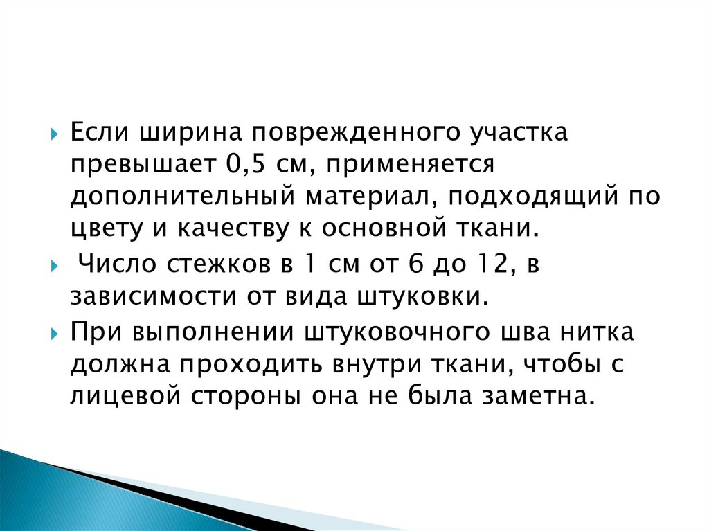 Зашить простой и сложный разрывы,произвести штуковку используя материал