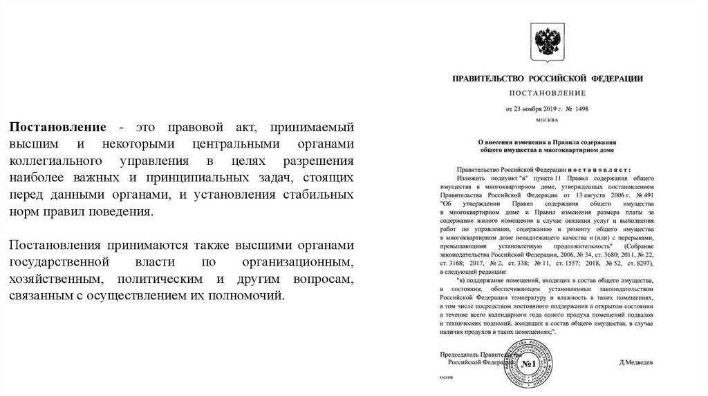 Постановление - это правовой акт, принимаемыйвысшим и некоторыми центральными органами
