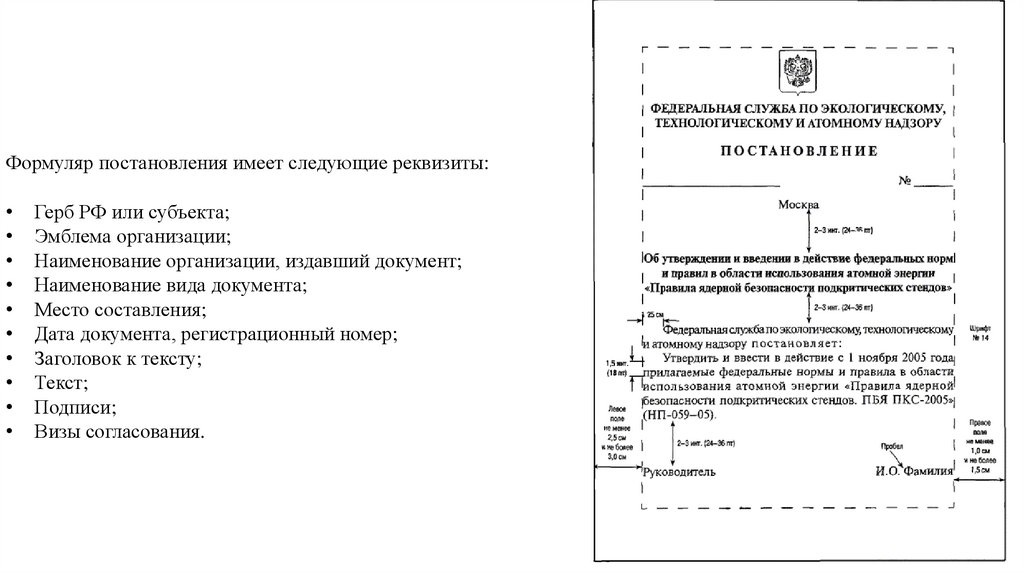 Формуляр постановления имеет следующие реквизиты:Герб РФ или субъекта;