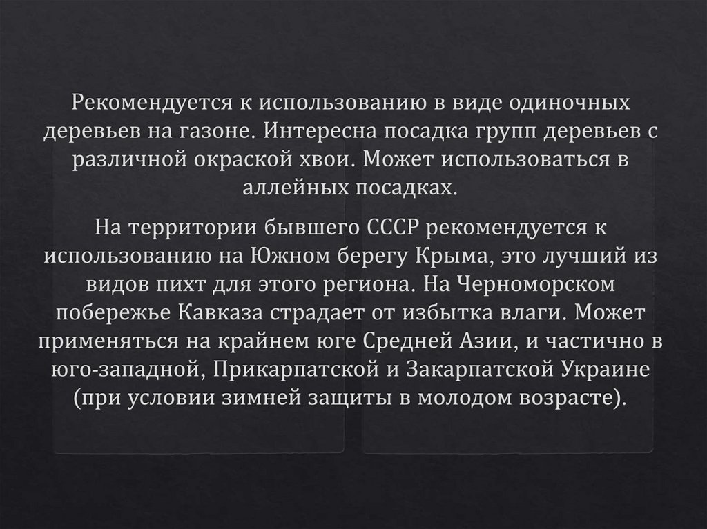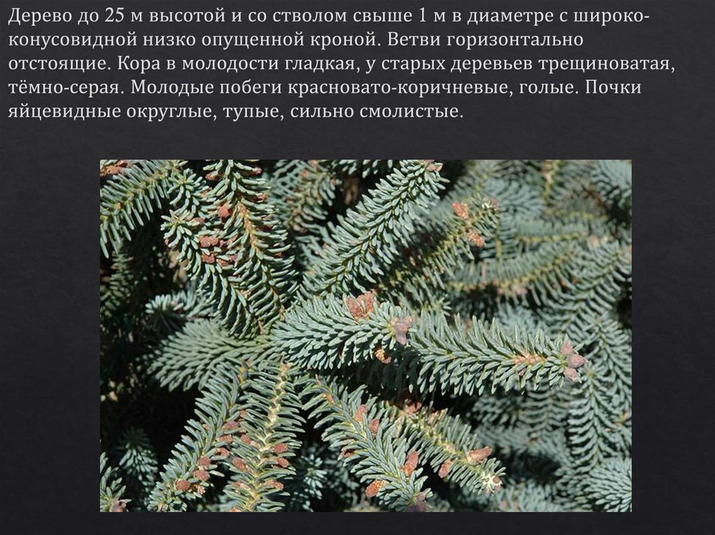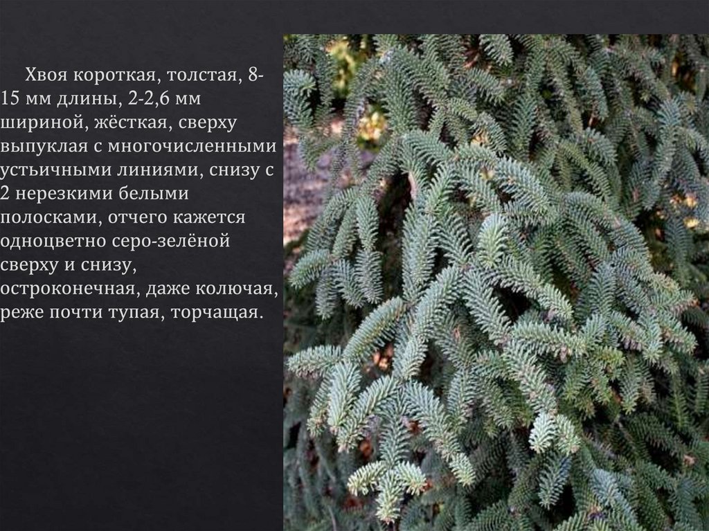 Весьма декоративная пихта, особенно при солитерной посадке, благодаря сине-или серо-зелёной, часто почти серебристой окраске