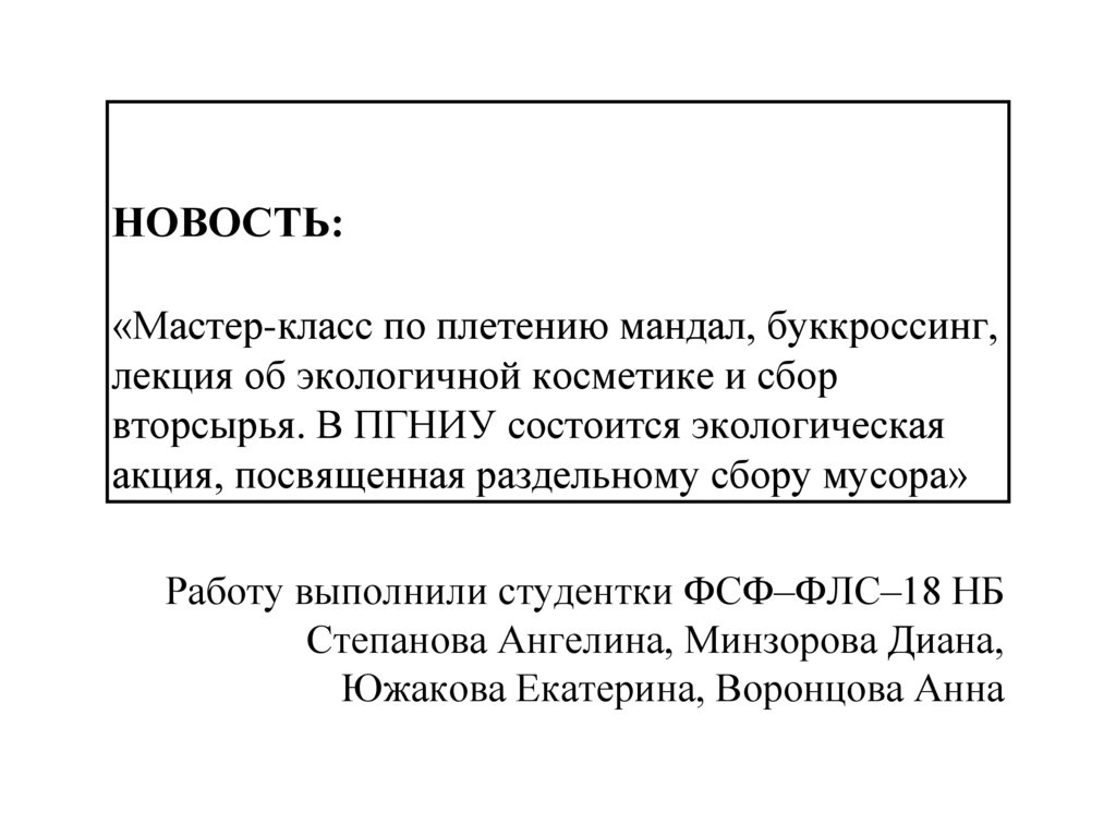 1. НОВОСТЬ: «Мастер-класс по плетению мандал, буккроссинг, лекция об экологичной косметике и сбор вторсырья. В ПГНИУ состоится