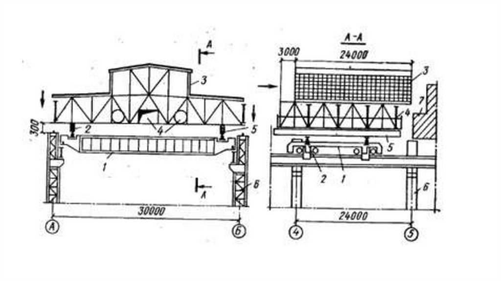 1 — стропильная ферма; 2 — подстропильная балка; 3 — ферма фонаря; прогон; б — вертикальные связи; 6 — горизонтальные связи