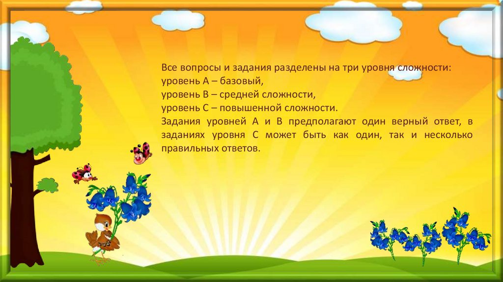 Все вопросы и задания разделены на три уровня сложности:уровень А – базовый,