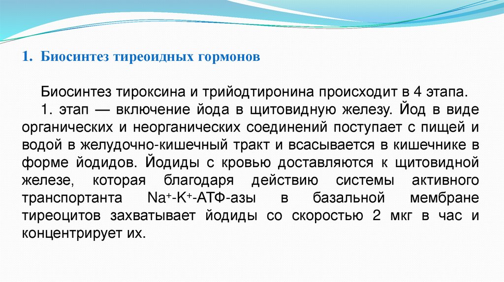 1. Биосинтез тиреоидных гормоновБиосинтез тироксина и трийодтиронина происходит в 4 этапа.