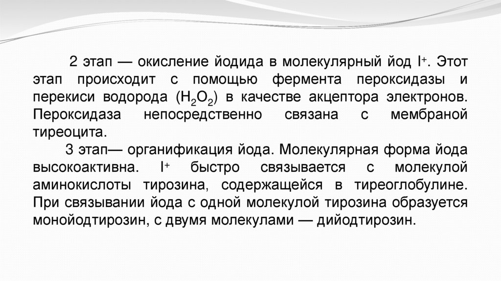2 этап — окисление йодида в молекулярный йод I+. Этотэтап происходит с помощью фермента пероксидазы и
