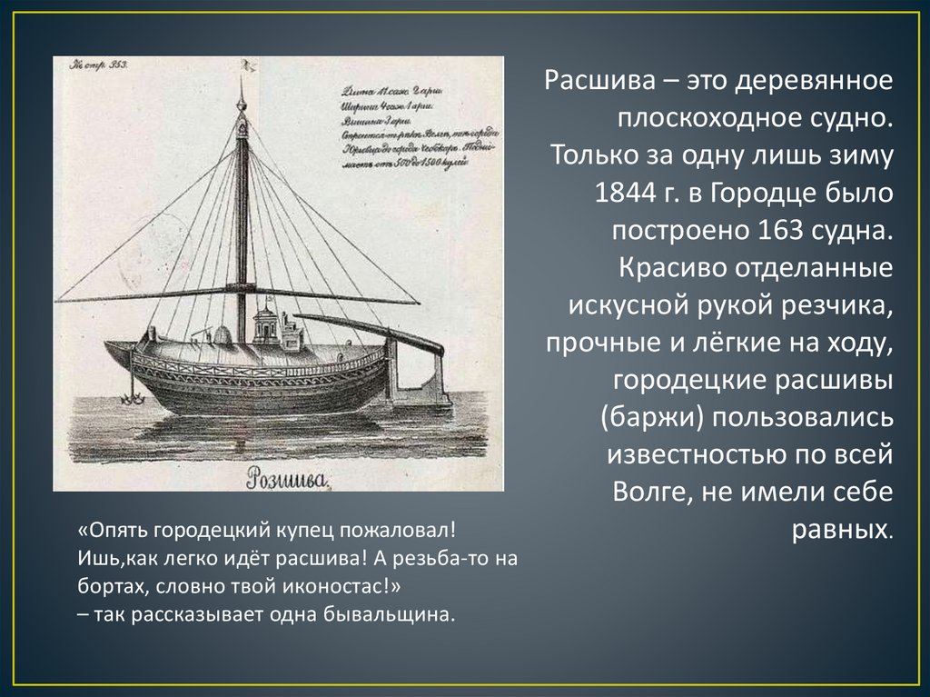 «Опять городецкий купец пожаловал!Ишь,как легко идёт расшива! А резьба-то на