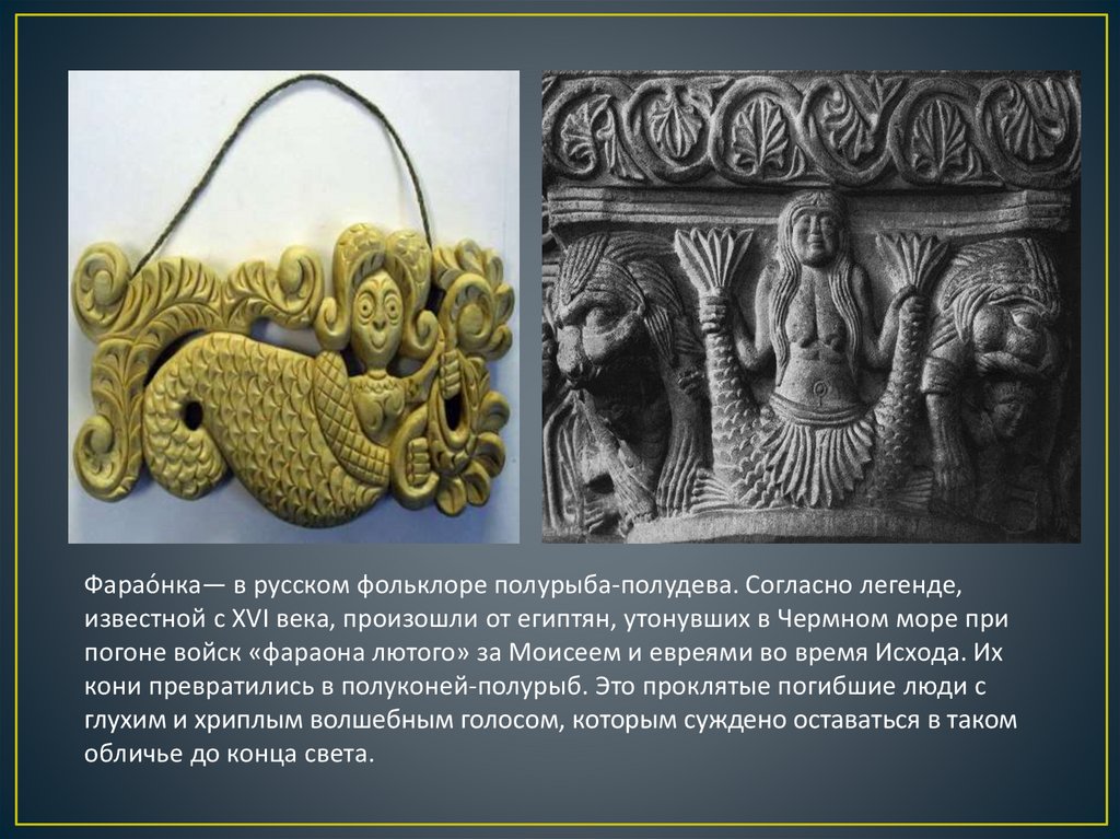 Фарао́ нка— в русском фольклоре полурыба-полудева. Согласно легенде,известной с XVI века, произошли от египтян, утонувших в Чермном море при
