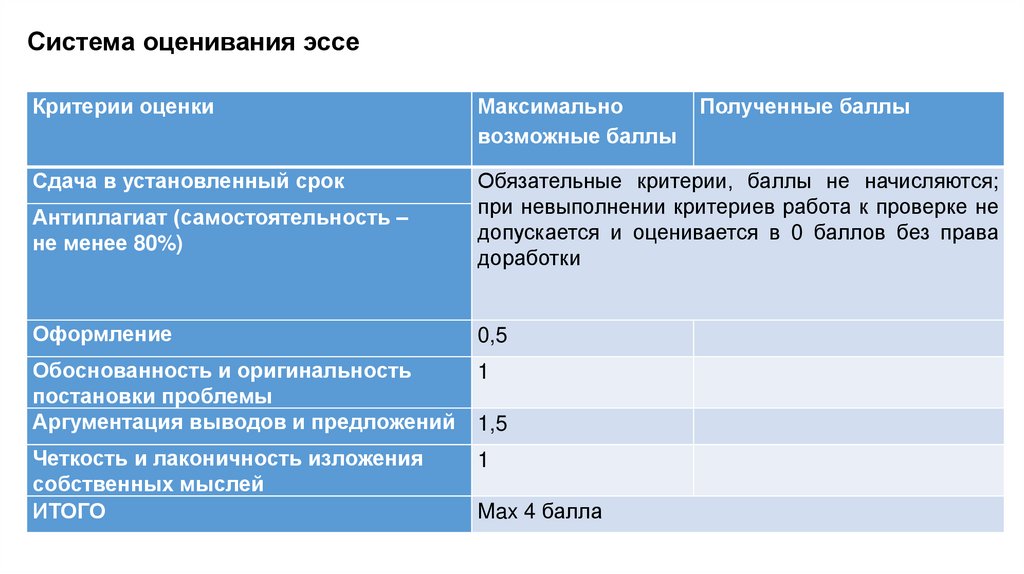 Система оценивания эссеКритерии оценки