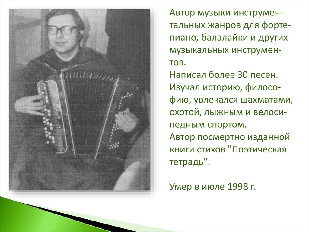 Автор музыки инструментальных жанров для фортепиано, балалайки и другихмузыкальных инструментов.