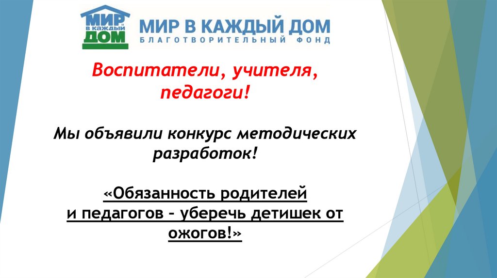 1. Воспитатели, учителя, педагоги! Мы объявили конкурс методических разработок! «Обязанность родителей и педагогов – уберечь
