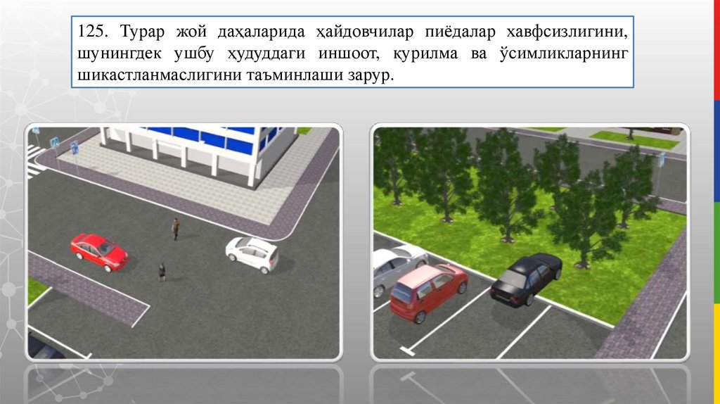 125. Турар жой даҳаларида ҳайдовчилар пиёдалар хавфсизлигини,шунингдек ушбу ҳудуддаги иншоот, қурилма ва ўсимликларнинг