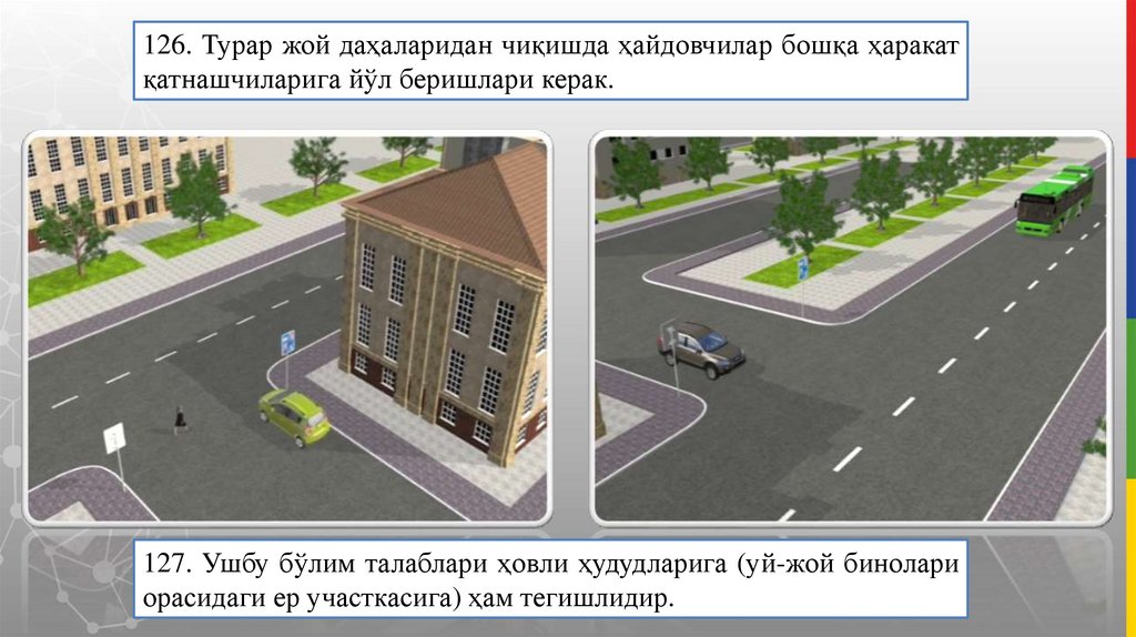 126. Турар жой даҳаларидан чиқишда ҳайдовчилар бошқа ҳаракатқатнашчиларига йўл беришлари керак.