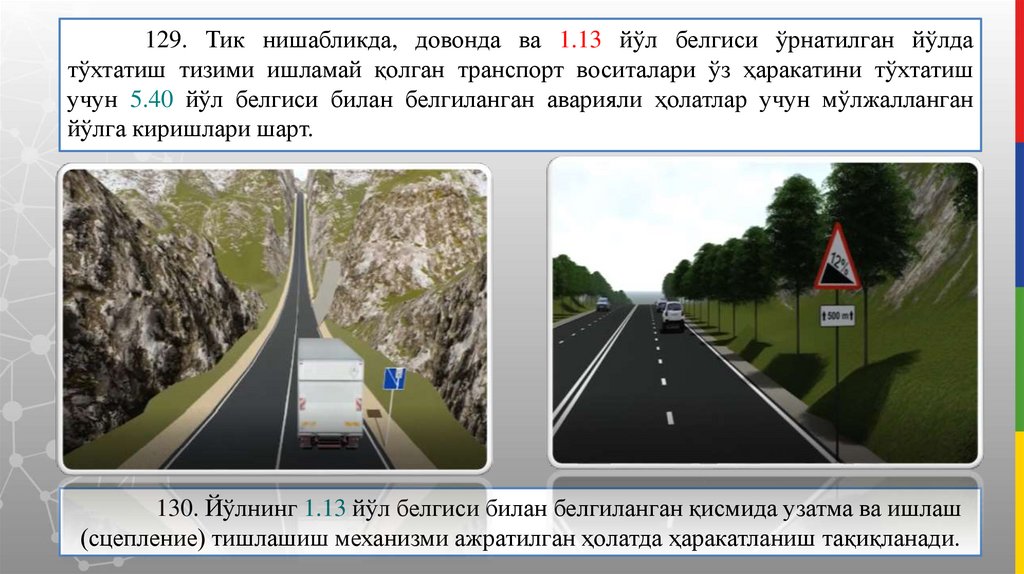 129. Тик нишабликда, довонда ва 1.13 йўл белгиси ўрнатилган йўлдатўхтатиш тизими ишламай қолган транспорт воситалари ўз ҳаракатини тўхтатиш