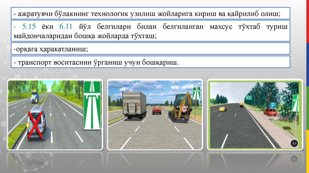 - ажратувчи бўлакнинг технологик узилиш жойларига кириш ва қайрилиб олиш;- 5.15 ёки 6.11 йўл белгилари билан белгиланган махсус тўхтаб туриш