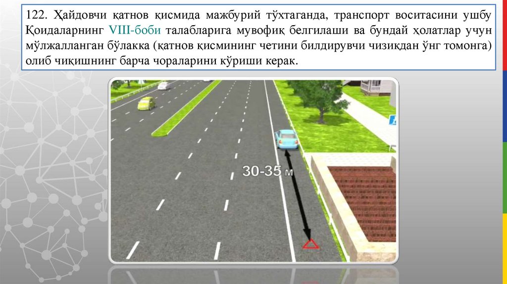 122. Ҳайдовчи қатнов қисмида мажбурий тўхтаганда, транспорт воситасини ушбуҚоидаларнинг VIII-боби талабларига мувофиқ белгилаши ва бундай ҳолатлар учун
