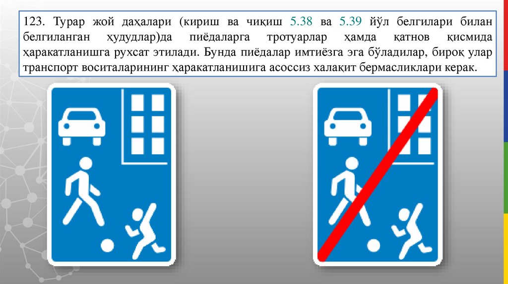 123. Турар жой даҳалари (кириш ва чиқиш 5.38 ва 5.39 йўл белгилари биланбелгиланган ҳудудлар)да пиёдаларга тротуарлар ҳамда қатнов қисмида