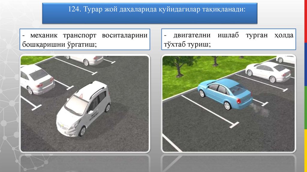 124. Турар жой даҳаларида қуйидагилар тақиқланади:- механик транспорт воситаларини