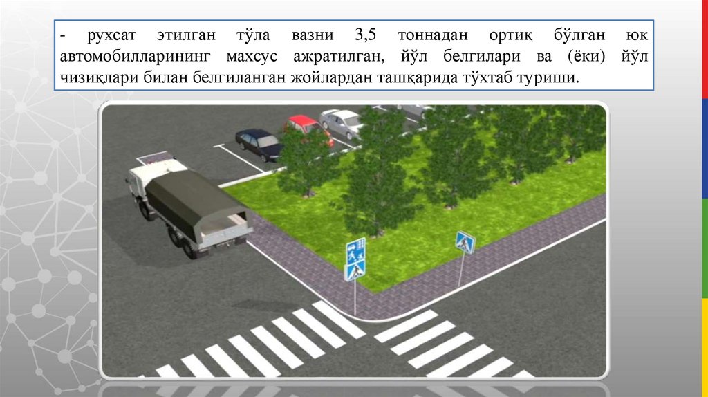 - рухсат этилган тўла вазни 3,5 тоннадан ортиқ бўлган юкавтомобилларининг махсус ажратилган, йўл белгилари ва (ёки) йўл