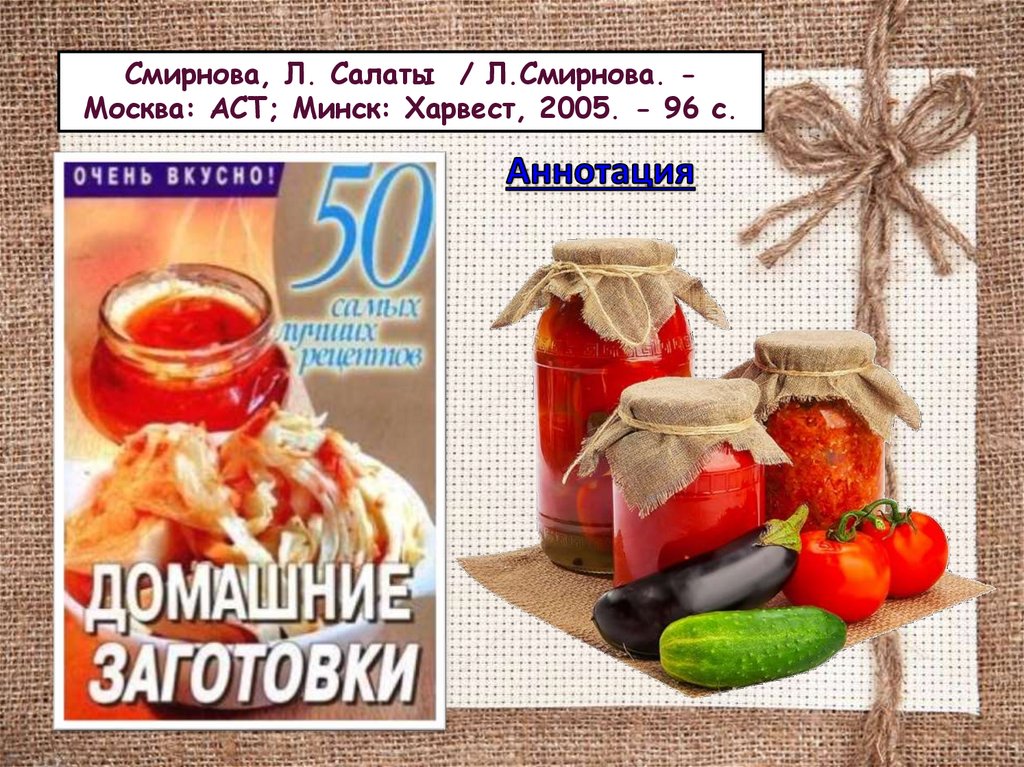 Смирнова, Л. Салаты / Л.Смирнова. Москва: АСТ; Минск: Харвест, 2005. - 96 с.7.