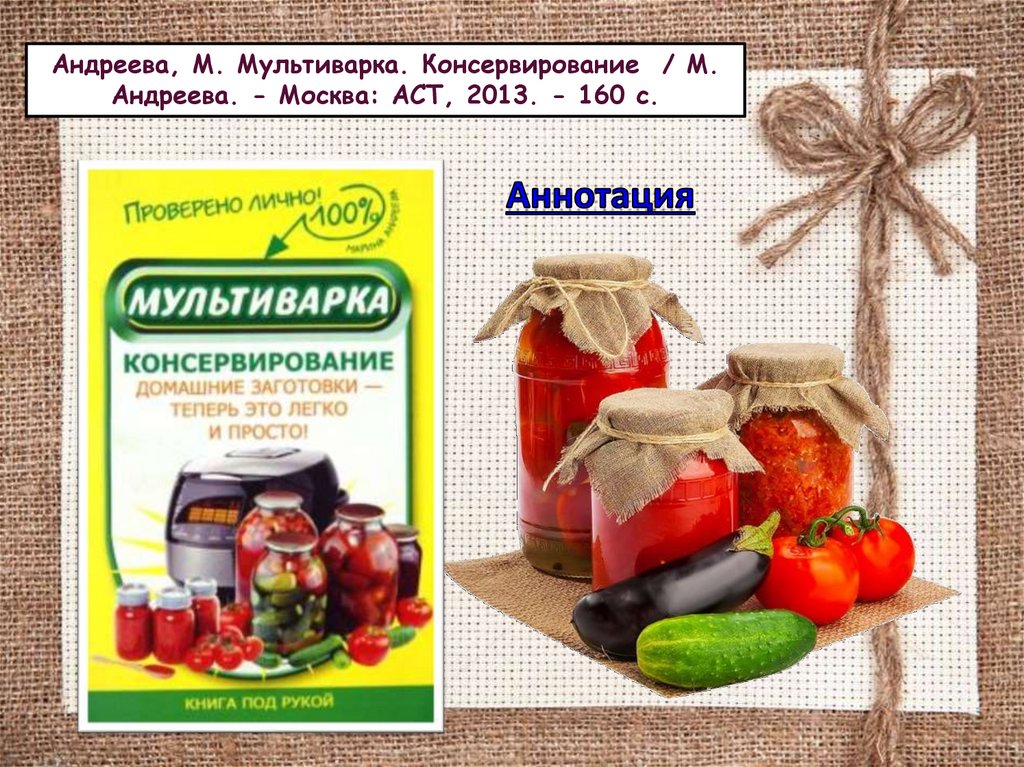 Андреева, М. Мультиварка. Консервирование / М.Андреева. - Москва: АСТ, 2013. - 160 с.