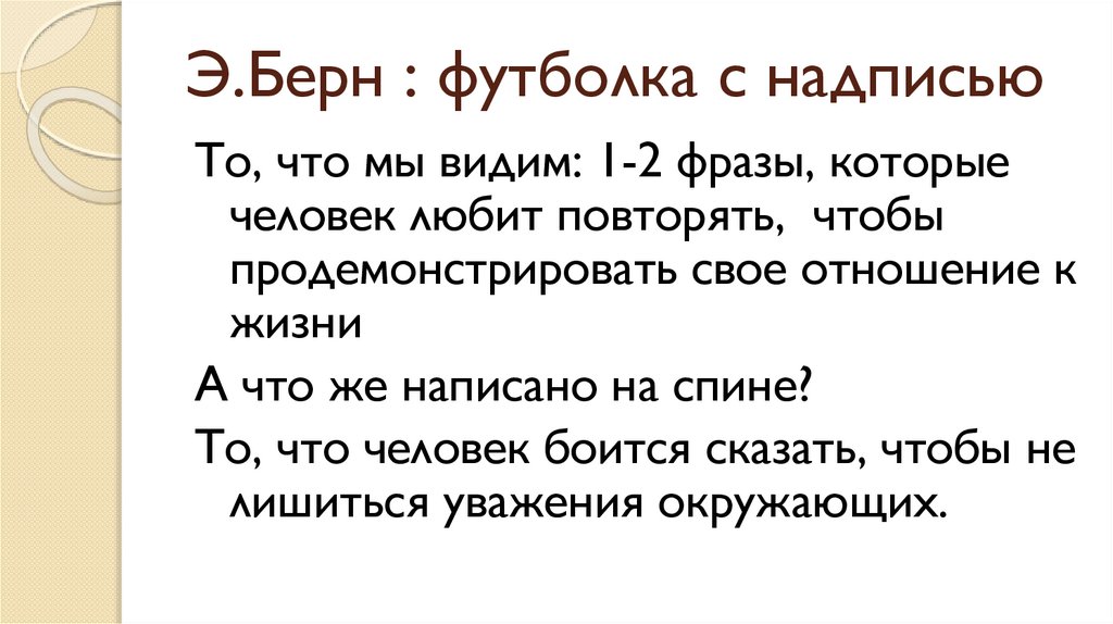 Э.Берн : футболка с надписьюТо, что мы видим: 1-2 фразы, которые