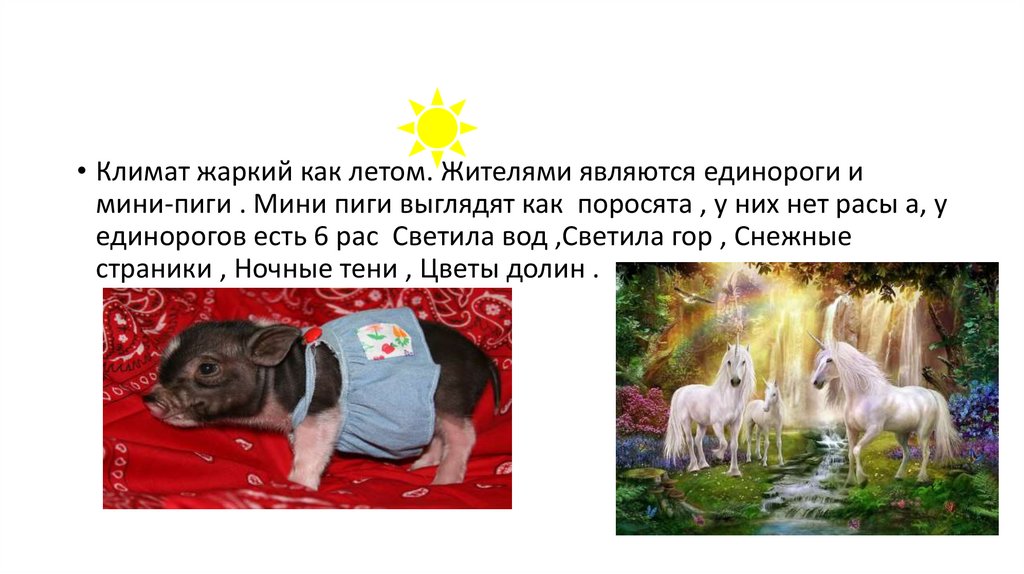 • Климат жаркий как летом. Жителями являются единороги имини-пиги . Мини пиги выглядят как поросята , у них нет расы а, у