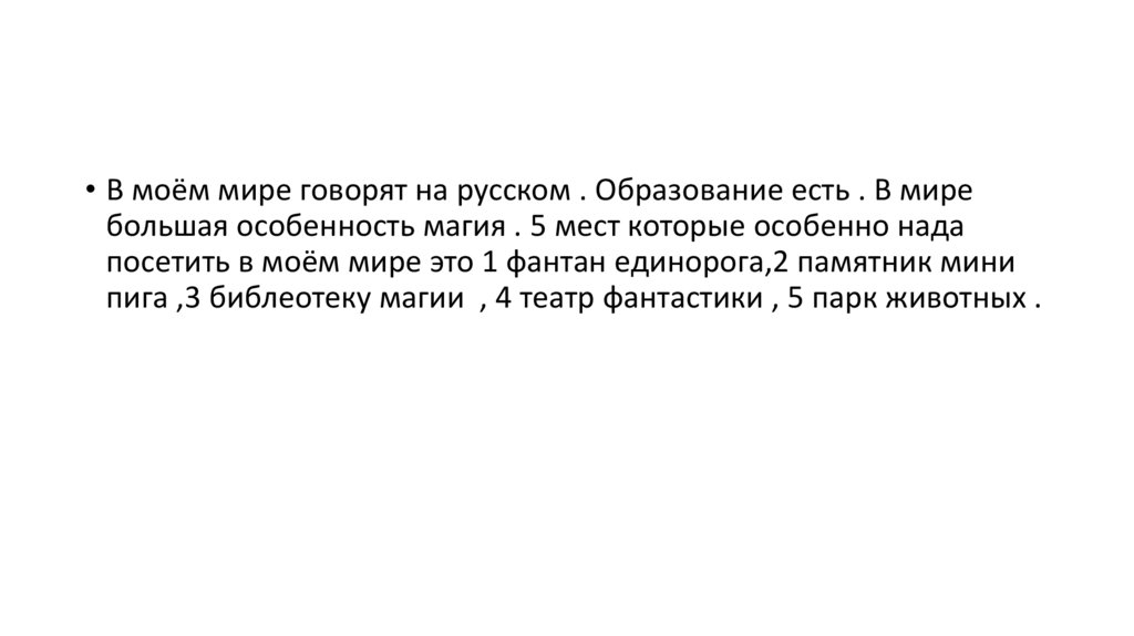 • В моём мире говорят на русском . Образование есть . В миребольшая особенность магия . 5 мест которые особенно нада