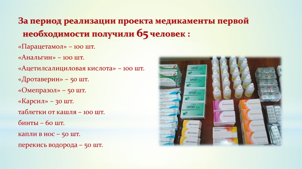 За период реализации проекта медикаменты первойнеобходимости получили 65 человек :