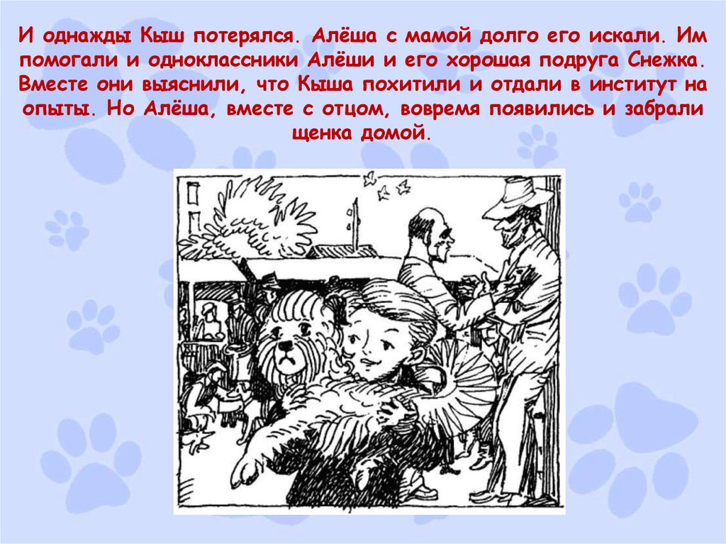 И однажды Кыш потерялся. Алёша с мамой долго его искали. Импомогали и одноклассники Алёши и его хорошая подруга Снежка.
