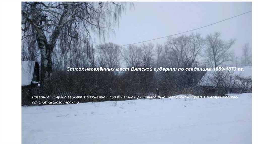 Список населённых мест Вятской губернии по сведениям 1859-1873 гг.Название – Слудка верхняя. Положение – при р. Вятке и рч. Качалдинке. Малмыжский уезд. По левую сторону