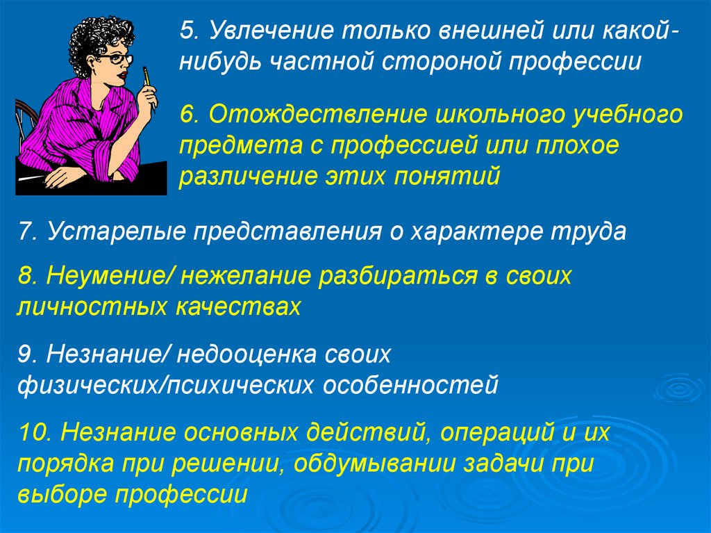 5. Увлечение только внешней или какойнибудь частной стороной профессии6. Отождествление школьного учебного