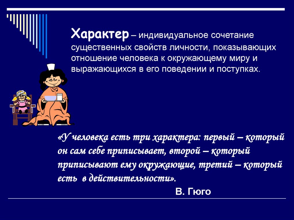 Характер – индивидуальное сочетаниесущественных свойств личности, показывающих