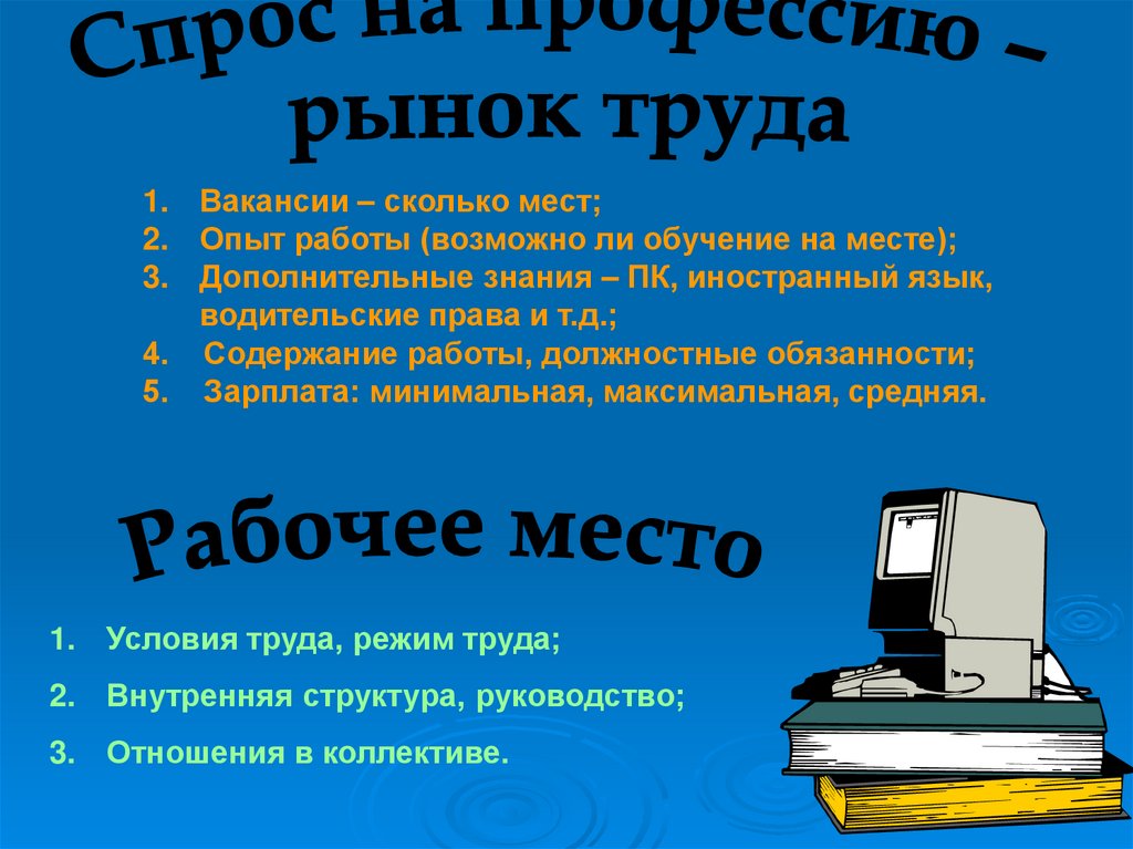 1. Вакансии – сколько мест;2. Опыт работы (возможно ли обучение на месте);