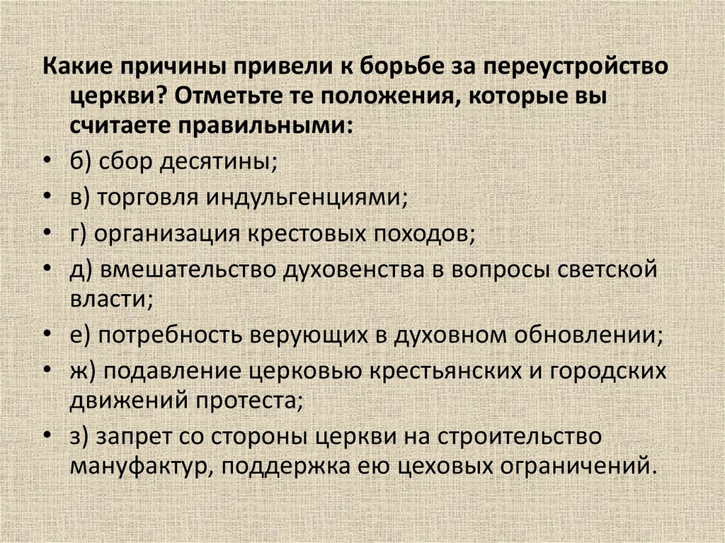 Какие причины привели к борьбе за переустройствоцеркви? Отметьте те положения, которые вы