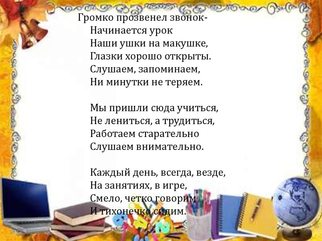 Громко прозвенел звонокНачинается урокНаши ушки на макушке,