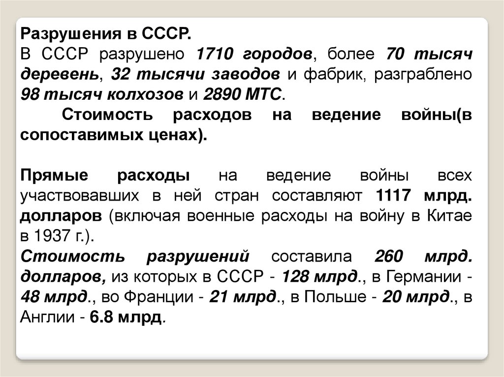 Разрушения в СССР.В СССР разрушено 1710 городов, более 70 тысяч