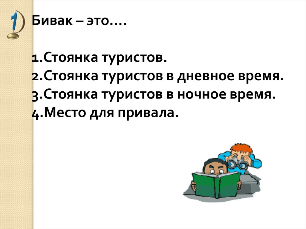 Бивак – это….1.Стоянка туристов.