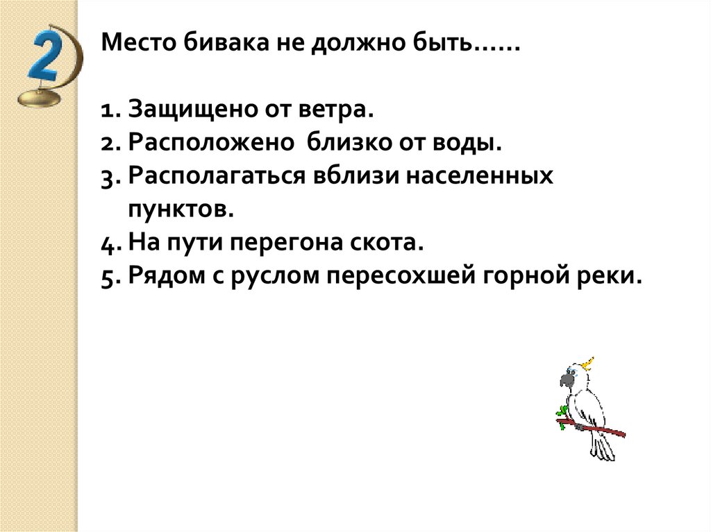 Место бивака не должно быть……1. Защищено от ветра.