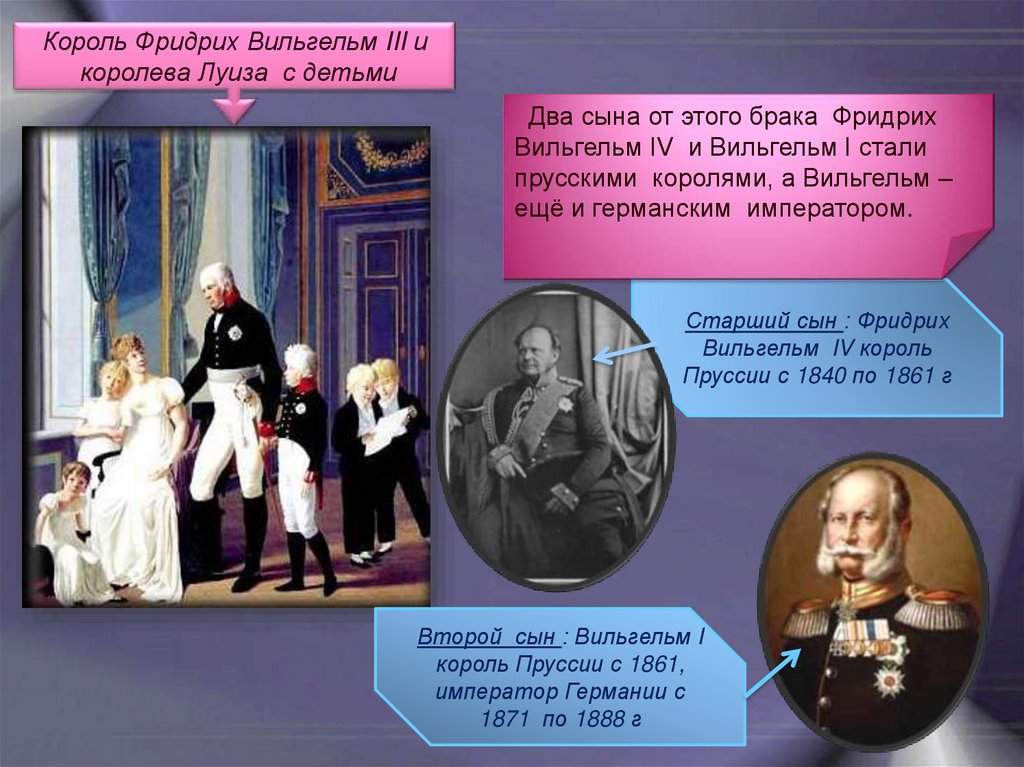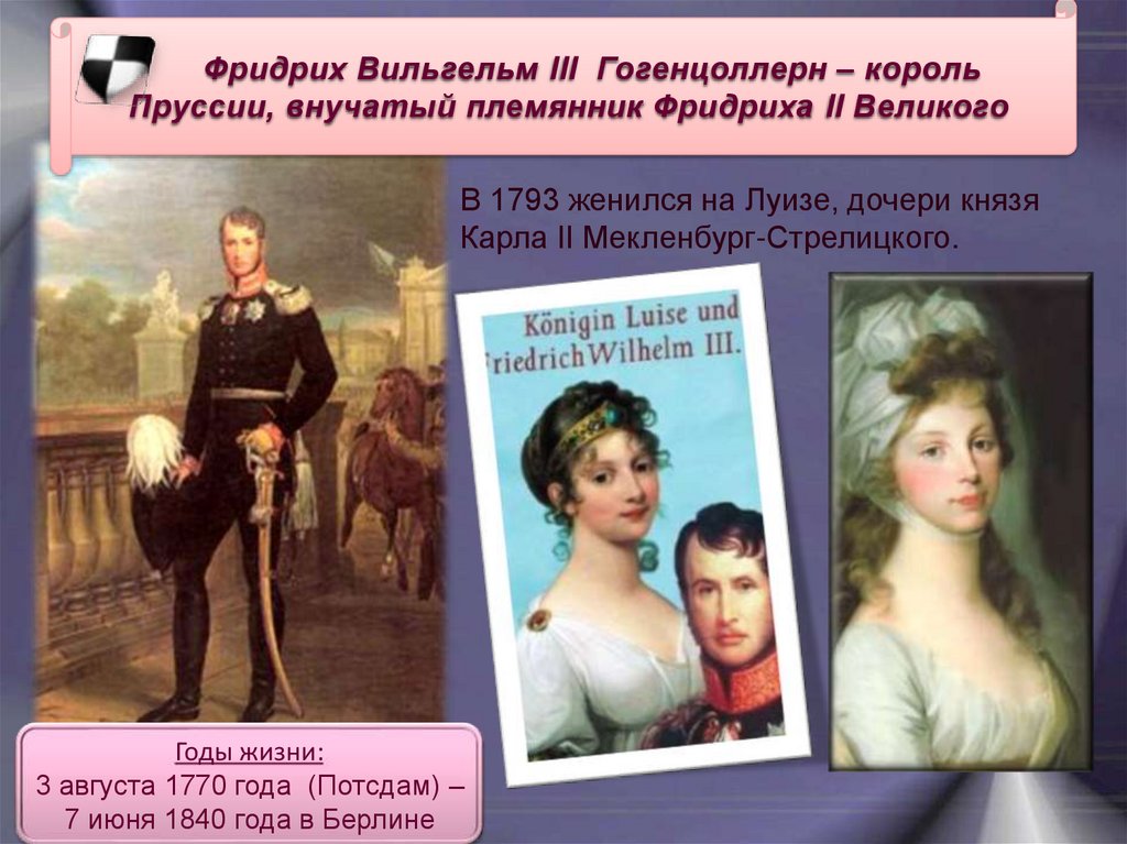 Фридрих Вильгельм III Гогенцоллерн – корольПруссии, внучатый племянник Фридриха II Великого