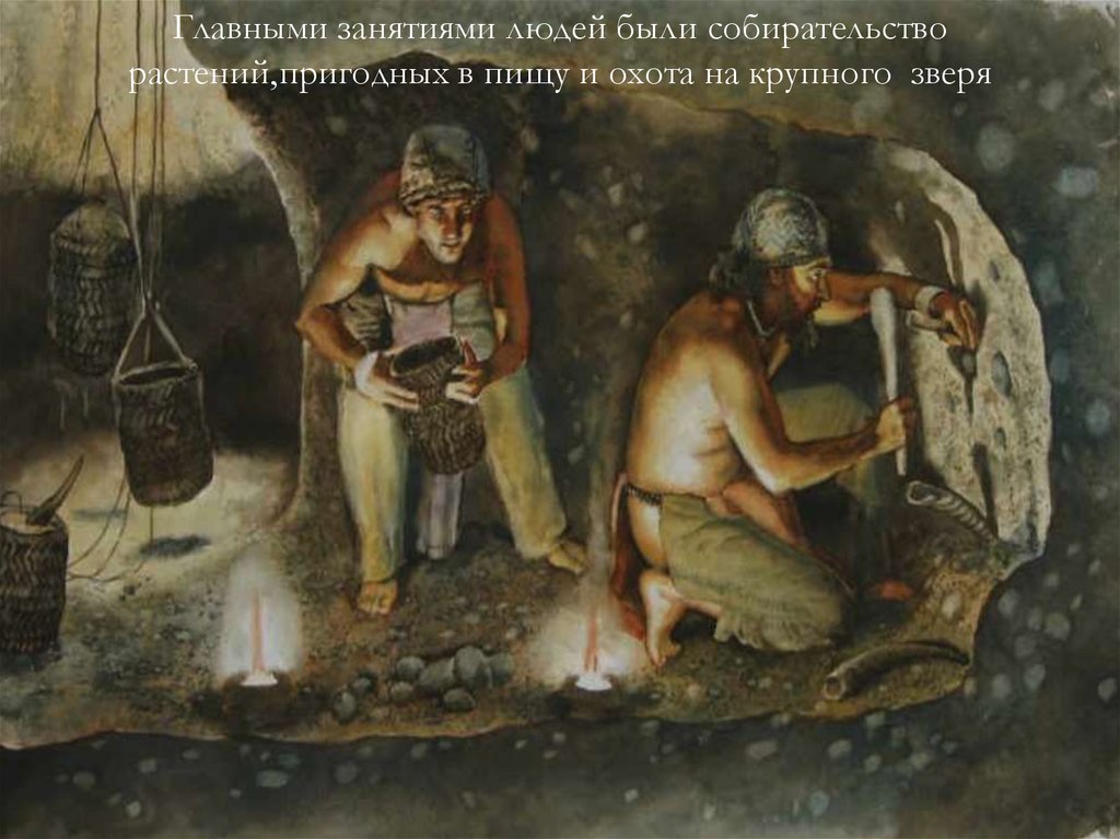 Главными занятиями людей были собирательстворастений,пригодных в пищу и охота на крупного зверя