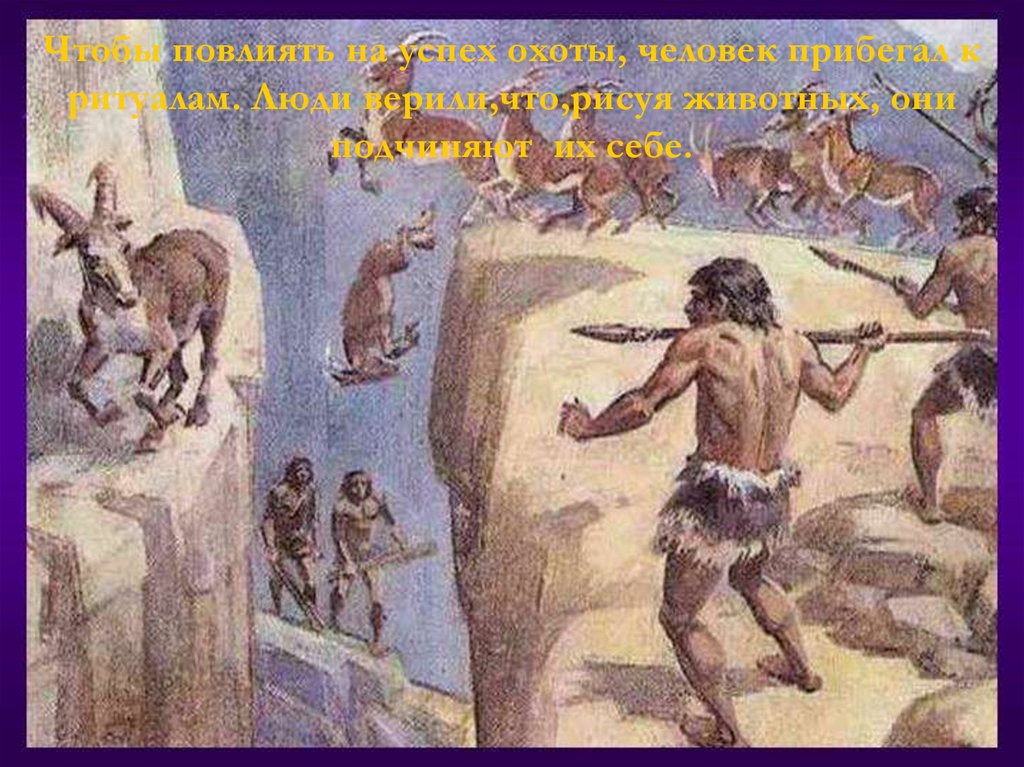 Чтобы повлиять на успех охоты, человек прибегал критуалам. Люди верили,что,рисуя животных, они