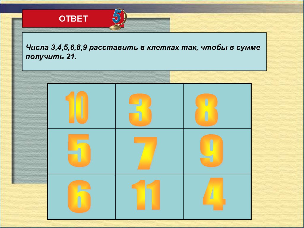 ОТВЕТЧисла 3,4,5,6,8,9 расставить в клетках так, чтобы в сумме