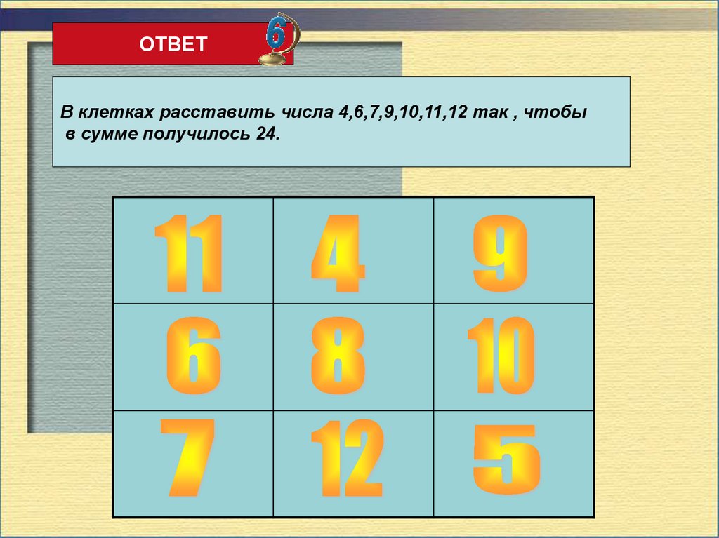 ОТВЕТВ клетках расставить числа 4,6,7,9,10,11,12 так , чтобы