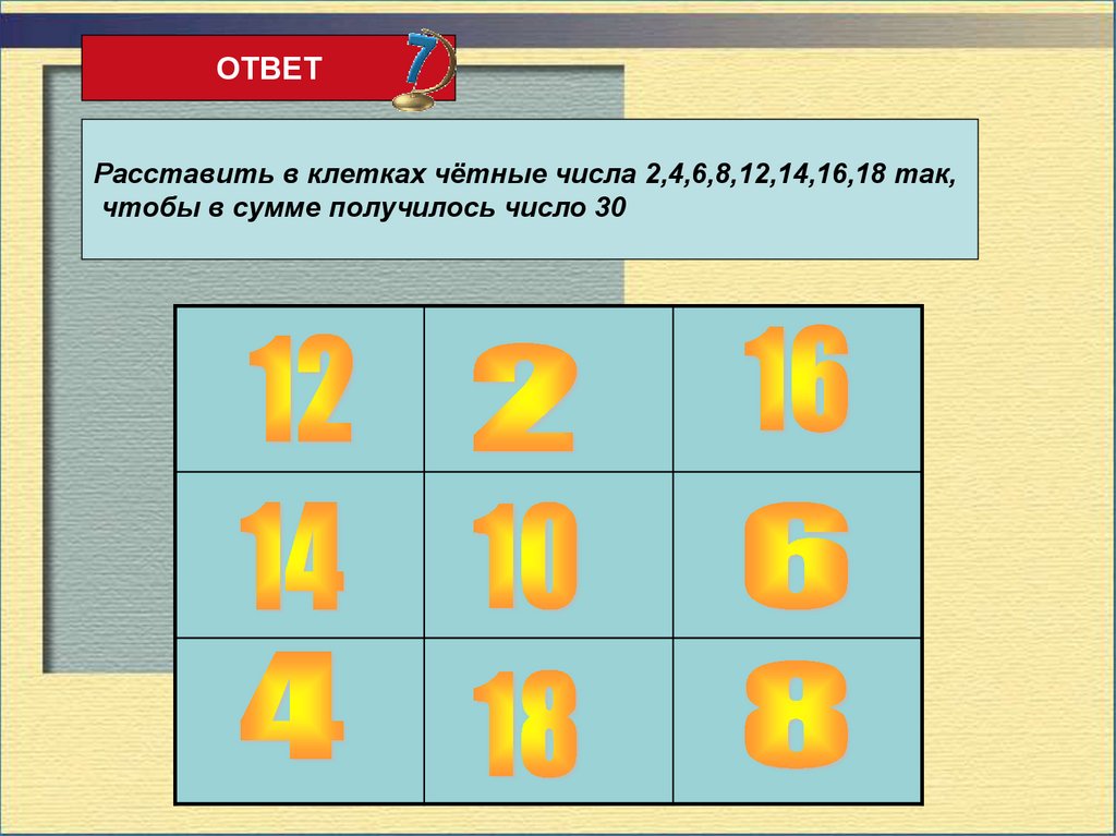 ЗАДАНИЕРасставить в клетках чётные числа 2,4,6,8,12,14,16,18 так,