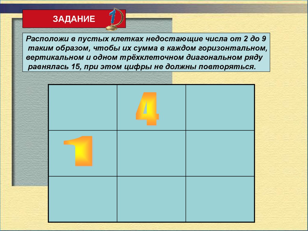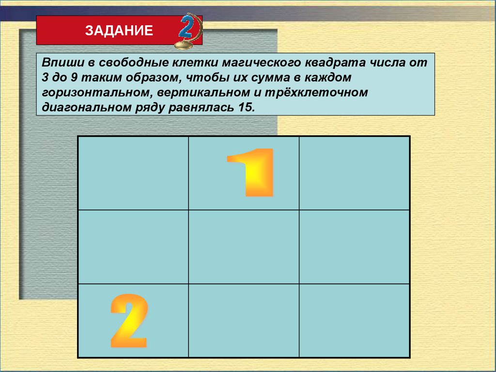 ЗАДАНИЕВпиши в свободные клетки магического квадрата числа от