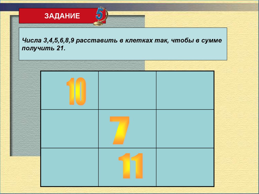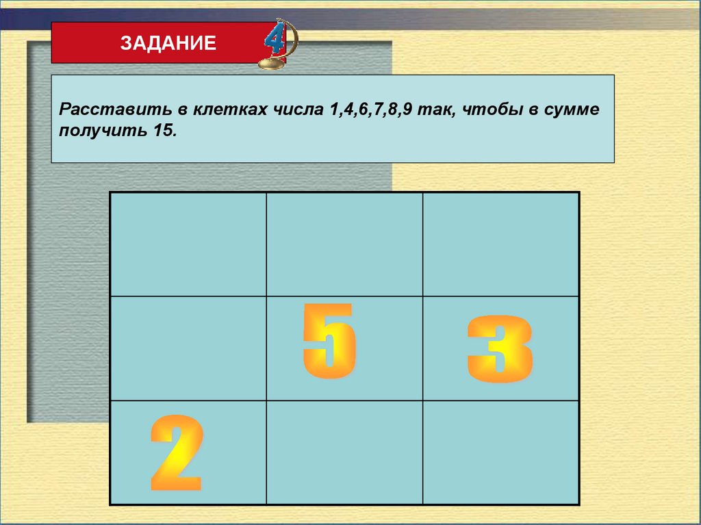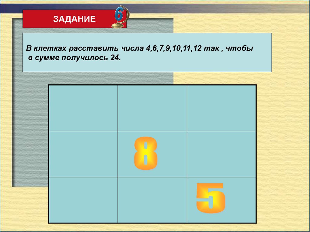ЗАДАНИЕРасставить в клетках числа 1,4,6,7,8,9 так, чтобы в сумме