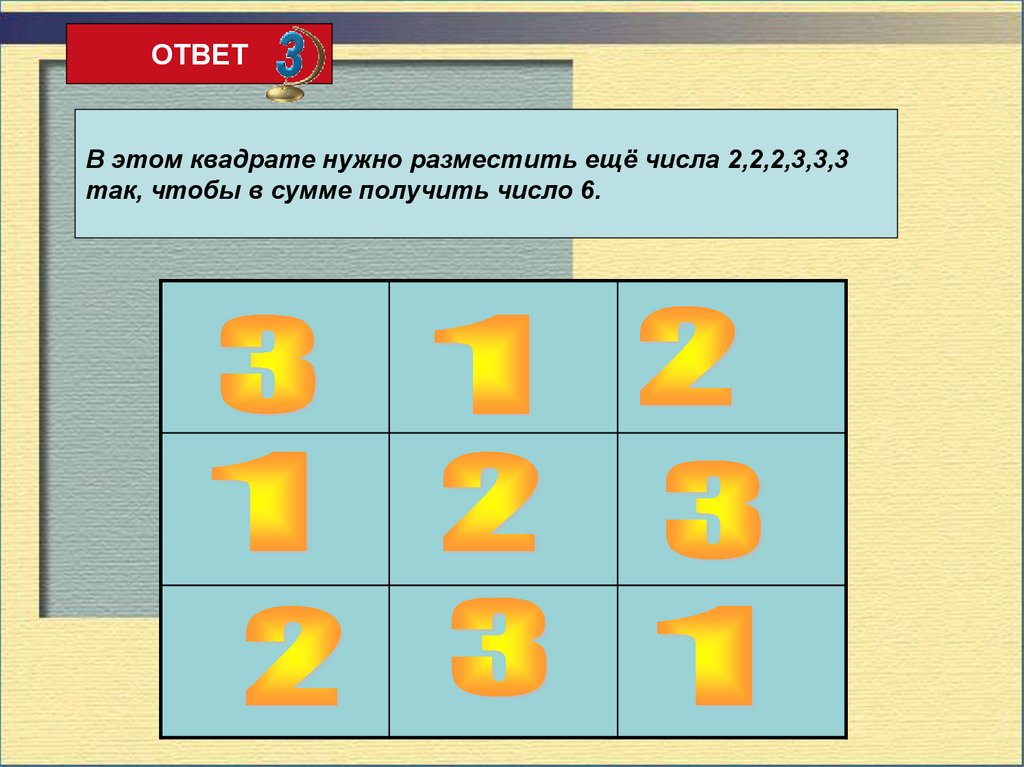 ОТВЕТВ этом квадрате нужно разместить ещё числа 2,2,2,3,3,3