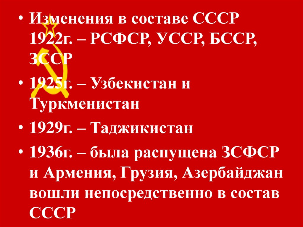 • Изменения в составе СССР1922г. – РСФСР, УССР, БССР,